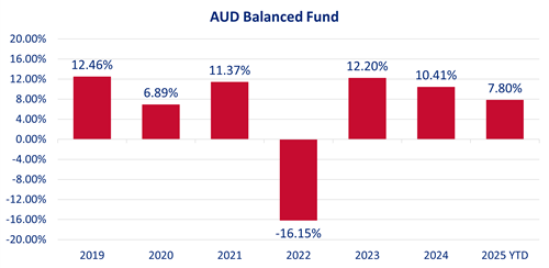 See the below performance figures for the AUD Balanced Fund as at 30 November 2025. The returns are after fees and after taxes: