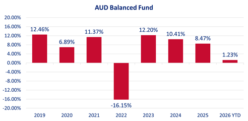 See the below performance figures for the AUD Balanced Fund as at 28 February 2026. The returns are after fees and after taxes: