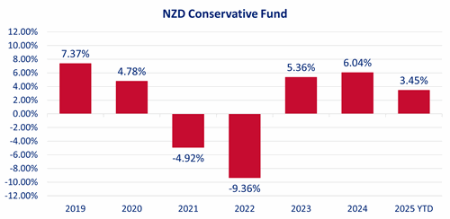 See the below performance figures for the NZD Conservative Fund as of 30 November 2025. The returns are after fees and after taxes: