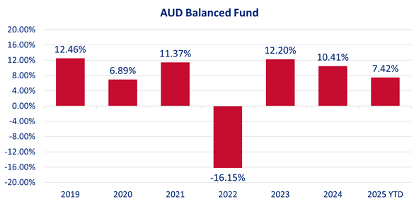 See the below performance figures for the AUD Balanced Fund as at 30 September 2025. The returns are after fees and after taxes: