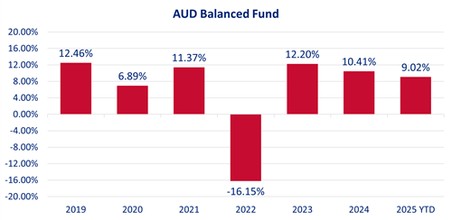 See the below performance figures for the AUD Balanced Fund as at 31 October 2025. The returns are after fees and after taxes: