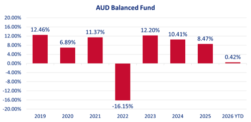 See the below performance figures for the AUD Balanced Fund as at 31 January 2026. The returns are after fees and after taxes: