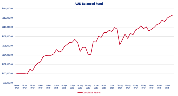 The chart below illustrates the performance of AUD $100,000 invested in the AUD Balanced Fund from inception on 24 December 2018 to 30 November 2019. The chart shows cumulative investment performance after fees, and tax (at 28%):