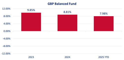 See the below performance figures for the GBP Balanced Fund as at 30 November 2025. The returns are after fees and after taxes: