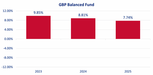 See the below performance figures for the GBP Balanced Fund as at 31 December 2025. The returns are after fees and after taxes: