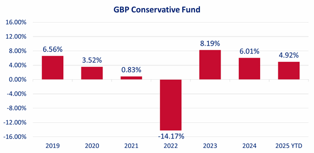 See the below performance figures for the GBP Conservative Fund as at 30 September 2025. The returns are after fees and after taxes: