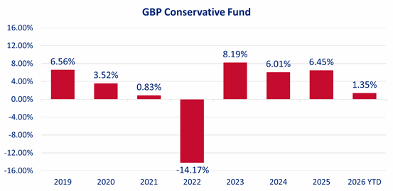See the below performance figures for the GBP Conservative Fund as at 28 February 2026. The returns are after fees and after taxes:
