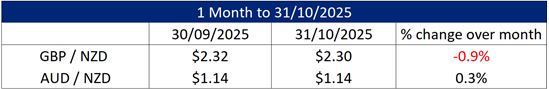 GBP and AUD / NZD exchange rate change from 30 September 2025 to 31 October 2025: