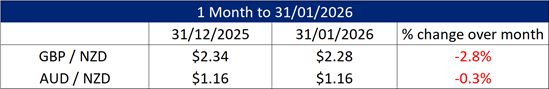 GBP and AUD / NZD exchange rate change from 31 December 2025 to 31 January 2026: