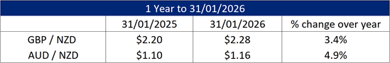 GBP and AUD / NZD exchange rate change from 31 January 2025 to 31 January 2026:
