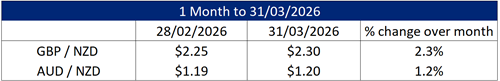 GBP and AUD / NZD exchange rate change from 28 February 2026 to 31 March 2026: