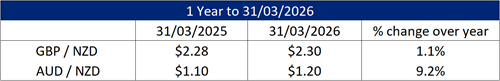 GBP and AUD / NZD exchange rate change from 31 March 2025 to 31 March 2026:
