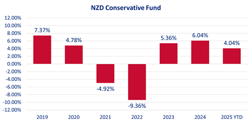 See the below performance figures for the NZD Conservative Fund as of 31 October 2025. The returns are after fees and after taxes: