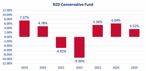 See the below performance figures for the NZD Conservative Fund as of 31 December 2025. The returns are after fees and after taxes: