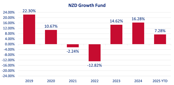 See the below performance figures for the NZD Growth Fund as at 30 September 2025. The returns are after fees and after taxes: