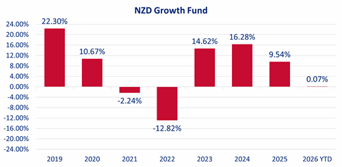 See the below performance figures for the NZD Growth Fund as at 28 February 2026. The returns are after fees and after taxes: